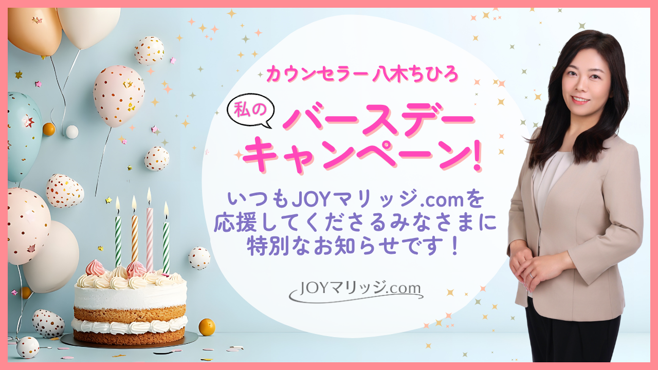 皆さまへの感謝の気持ちとして、私の誕生日を記念した特別なキャンペーンをご用意いたしました。婚活をスタートしたいけれど迷っている方、なかなか最初の一歩が踏み出せない方に、この機会をぜひご活用いただければと思います。